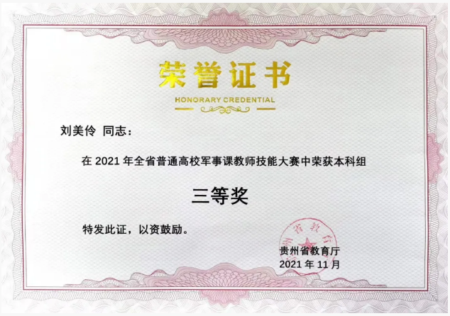 近日,在省教育厅主办的2021年全省普通高校军事课教师技能大赛中,经过初赛、视频复赛、现场决赛三个阶段的比拼,公司杨明老师讲授的《毛泽东军事思想之四渡赤水出奇兵》获二等奖,刘美伶老师讲授的《新时代国防的挑战与突围》获三等奖。