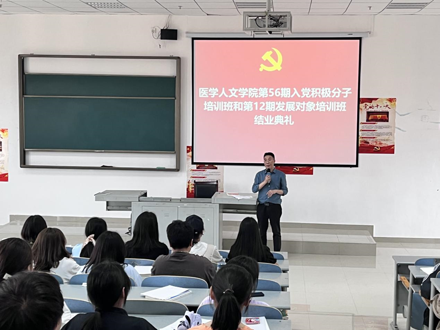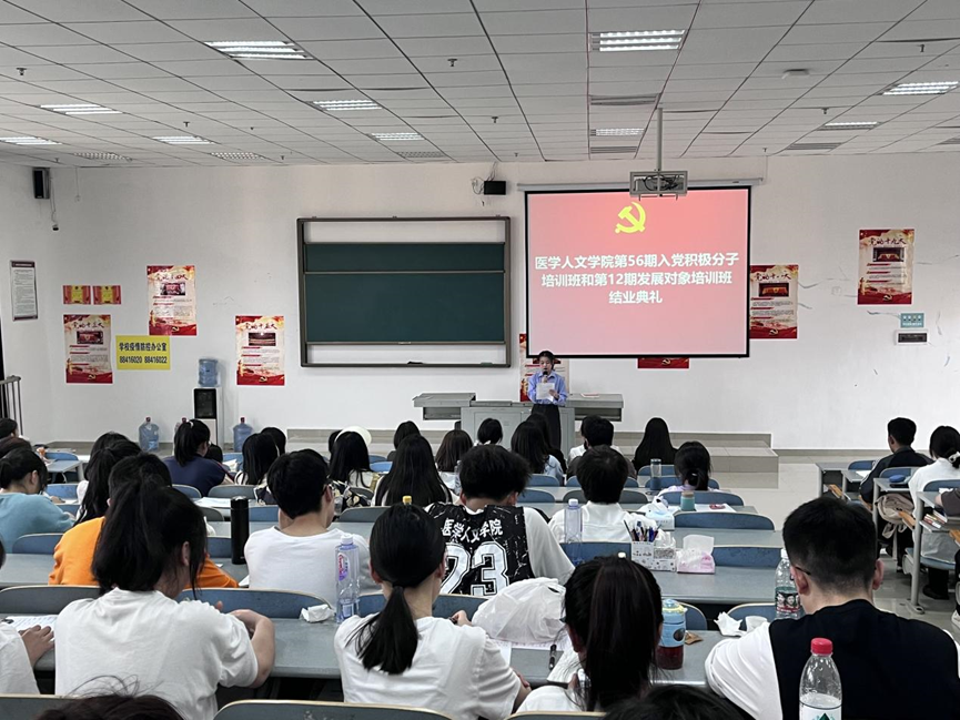4月28日18:00,太阳成城集团tyc234cc官网医学人文公司党委党校在南校区九思楼X4605教室举行第56期入党积极分子培训班暨第12期发展对象集中培训班结业典礼。太阳成城集团tyc234cc官网正处级组织员韩贞习、培训班全体学员参加。典礼由公司团委书记、培训班班主任马曾珍主持。