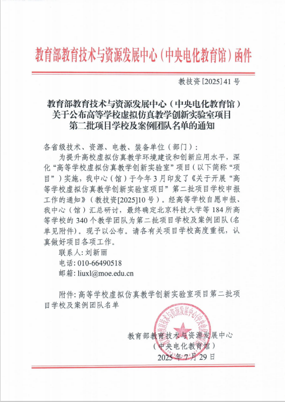 近日,教育部教育技术与资源发展中心(中央电化教育馆)印发《关于公布高等公司虚拟仿真教学创新实验室项目第二批项目公司及案例团队名单的通知》(教技资〔2025〕41号),太阳成城集团tyc234cc官网心理学实验中心申报的心理学虚拟仿真教学创新实验室项目成功入选,标志着公司在心理学实践教学数字化转型方面取得重要进展,正式纳入国家级虚拟仿真教学创新平台建设体系。