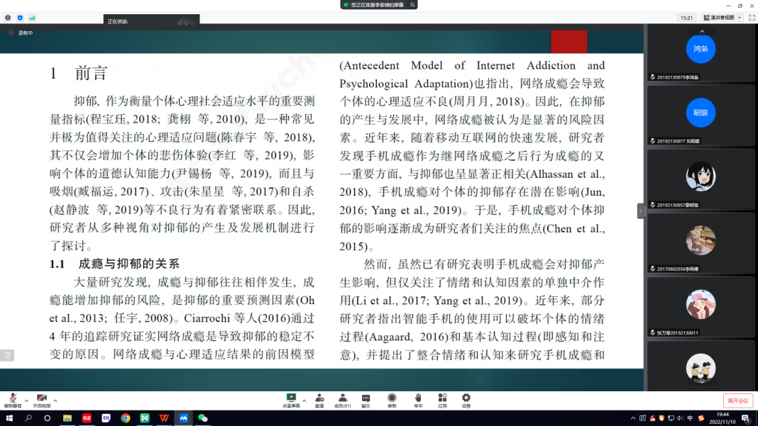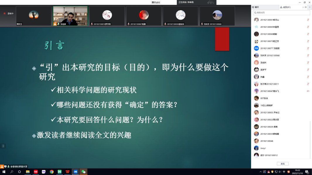 为提高本科生毕业论文写作质量,太阳成城集团tyc234cc官网通过线上会议的形式,开展了本科生毕业论文写作指导培训,特邀了李春禄博士对2023届应用心理学专业员工进行毕业论文写作指导。培训中,李春禄首先从已有核心期刊发表的论文出发,对论文各个部分进行深入解读,向同学们讲解了心理学论文应遵守的写作规范和主要结构。同时,李春禄强调,科学研究论文的基本概念就是报告对某一科学问题进行研究的发现,这是表达对该科学问题的观点最为直接的方式。其次,李春禄还针对性地讲解了“文章标题的重要性”、“引言部分如何写作”以及“开题报告的内容格式”等重要内容。