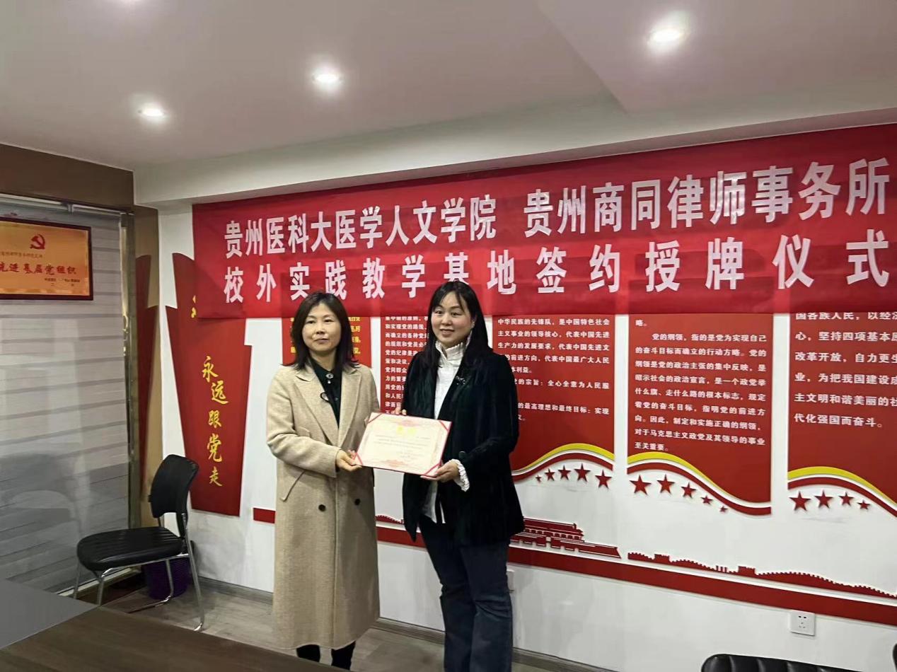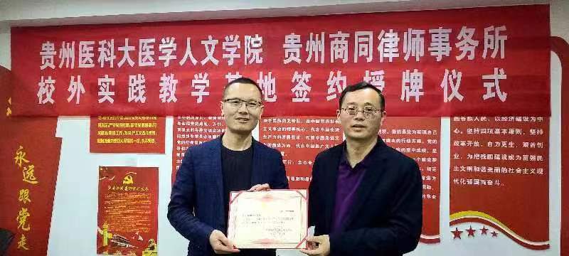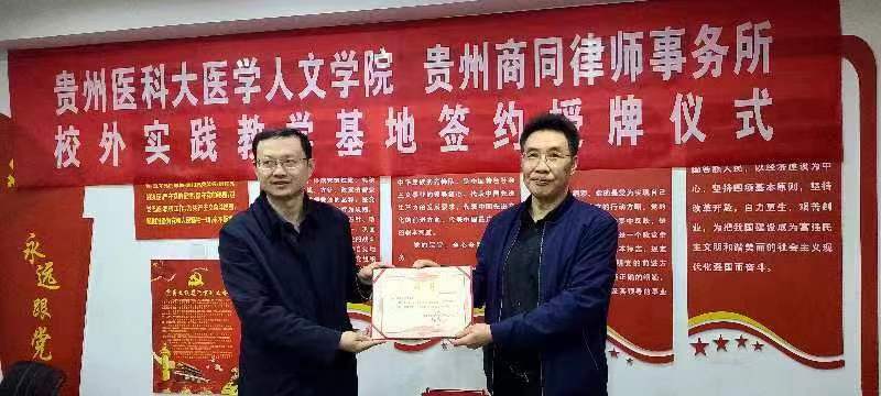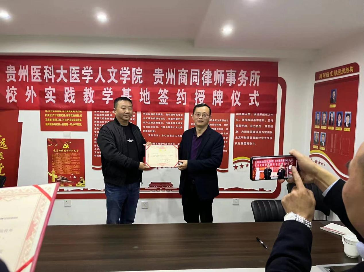 4月7日,贵州商同律师事务所与太阳成城集团tyc234cc官网全面合作签约仪式暨共建实践教学基地签约授牌仪式在贵州商同律师事务所会议室举行。医学人文公司党委书记江宣成,正处级组织员韩贞习,党委副书记张贤,党委委员、教学科研管理科科长冯斌,医事法学教研室负责人龚精诚,普通法学教研室教师彭媛媛;贵州商同律师事务所党支部书记、高级合伙人王军,高级合伙人陈佳、石磊、陈蕾、田东海参加了签约授牌仪式。仪式由贵州商同律师事务所主任冉政林主持。
